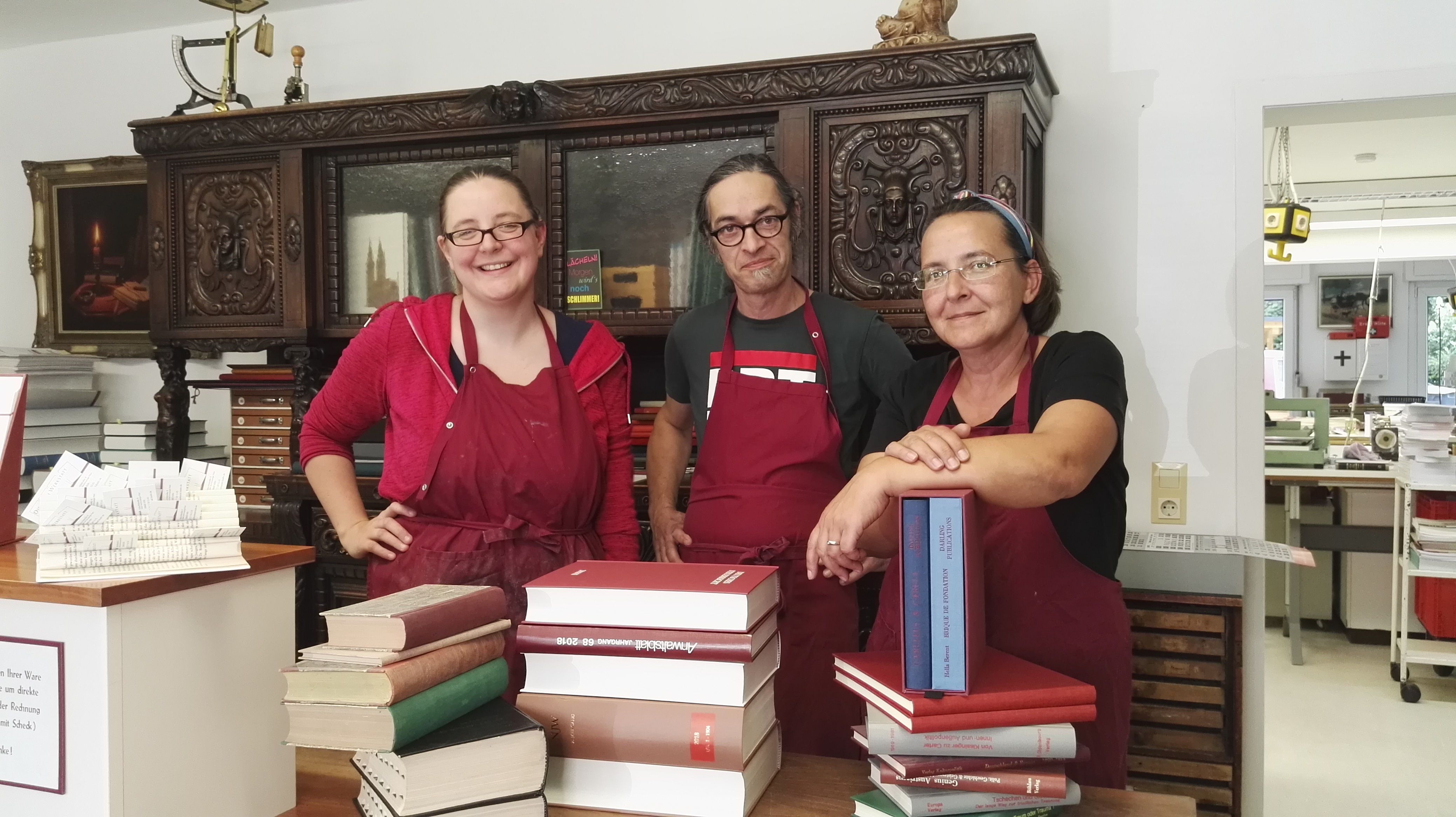 Buchbinderei im Kölner AgnesviertelHerzlich Willkommen auf unserer Internetseite.Wir möchten Ihnen die vielseitigen Möglichkeiten einer handwerklichen Buchbinderei vorstellen. Die Erfahrung unseres alten Handwerks, sowie unsere Fähigkeiten sollten Sie nutzen, besonders bei Einzelanfertigungen. Wir stellen Bücher, Mappen und Kassetten her, binden Zeitschriften und reparieren alte Bücher. Auch Ihr Lieblingsbuch. Als Meisterbetrieb beschäftigen wir ausschließlich handwerkliches Fachpersonal. Wir haben viel Erfahrung in unserem Handwerk und beraten Sie gerne. |